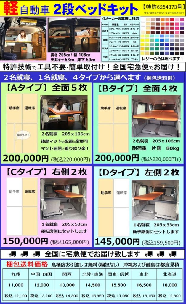 残念ながら、材料高など諸事情により今ではスズキ純正の2段ベッドキットより高くなっちゃいましたが、それでも良いからと検討される方は、コチラより問合せお願いします