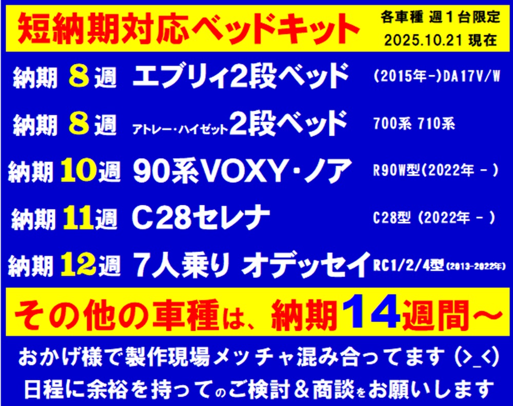 なおセレナ用の『後部棚板』のみ、『幼児用2段ベッドキット』のみ、などオプションのみの単品販売は一切していません