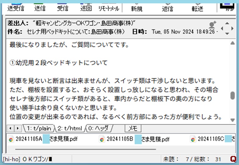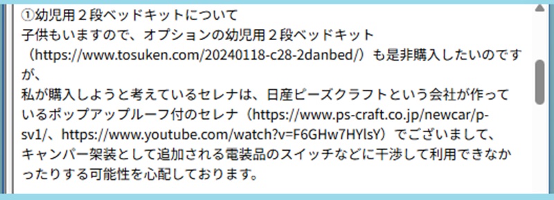 それで、ベッドキットの説明と見積を送信した際、問題点を書き加えました