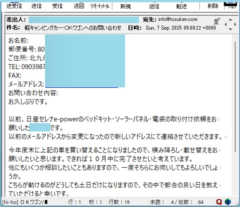 18年前に軽キャンを作り始めましたが、納車後のメンテナンスを行うには、我社にお越し頂く必要あり、当初は地元の九州の方を対象としていたので、特に問題ありませんでした