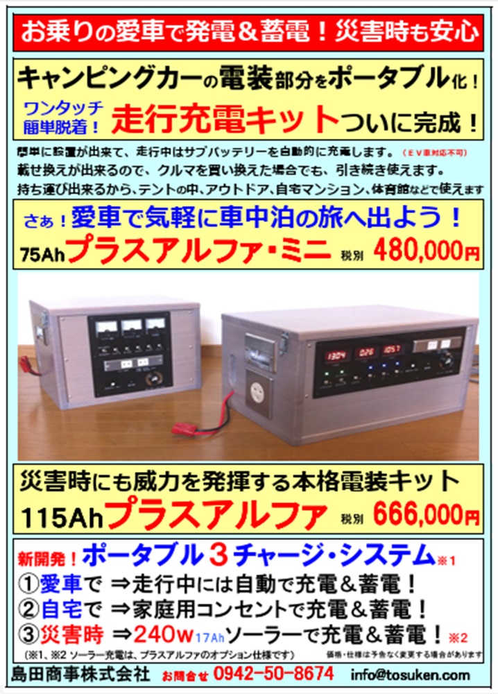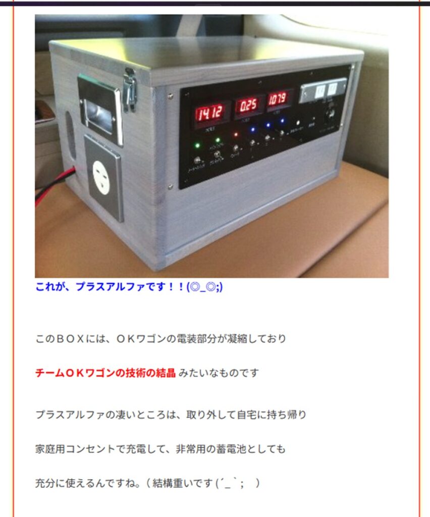 ポータブル電源が世に出る2016年の4年も前に、ポタ電を飛び越えてキャンピングカーとして走行充電するポータブル電装システムを作って市販化した訳で、凄いなぁ、OKワゴン!島田商事株式会社!