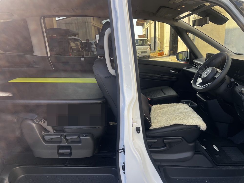 我社のセレナ用ベッドキットの前受けはフレーム式でなくポン置きにて、ベッド展開した状態で運転ポジション確保できます