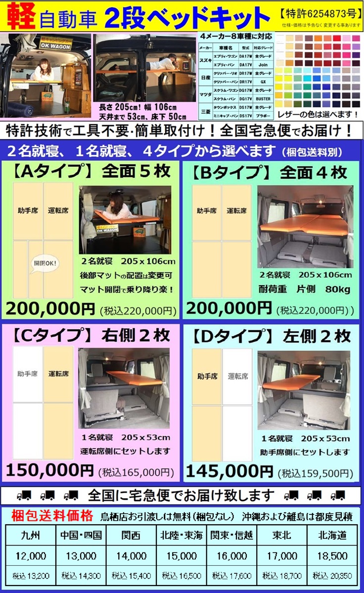 残念ながら、材料高など諸事情により今ではスズキ純正の2段ベッドキットより高くなっちゃいましたが、それでも良いからと検討される方は、コチラより問合せお願いします
