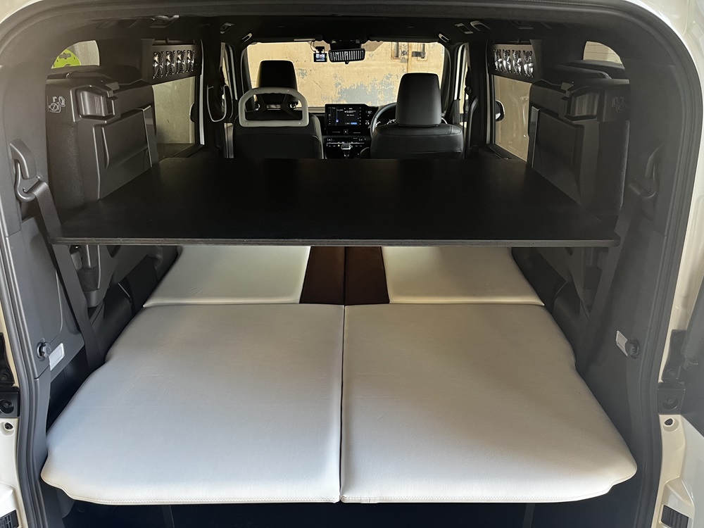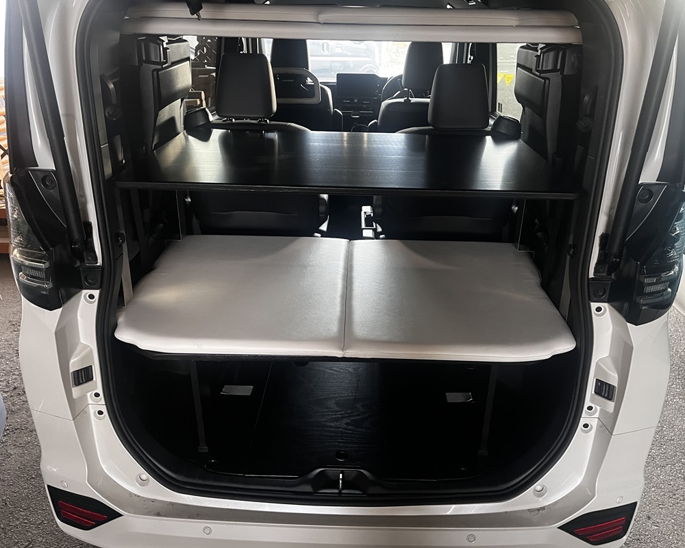 ただ、K様にも説明しましたが、たてまえ上は、あくまでも車中泊する際に荷物を置く為の後部棚板にて、『走行中は物を置かないで下さい』としてます