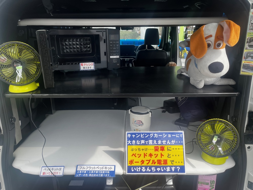 北海道・東北・北陸・東京・愛知・大阪など全国の各地のキャンピングカーショーに、軽キャンOKワゴンに展示備品を満載して自走して出展してましたが、途中で車中泊する時に30cmの棚板でも便利な事を知りました