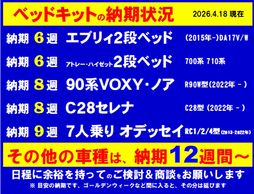 残念ながら、材料高など諸事情により今ではスズキ純正の2段ベッドキットより高くなっちゃいましたが、それでも良いからと検討される方は、コチラより問合せお願いします